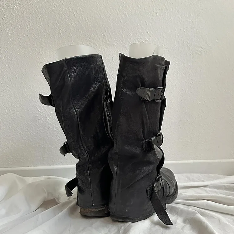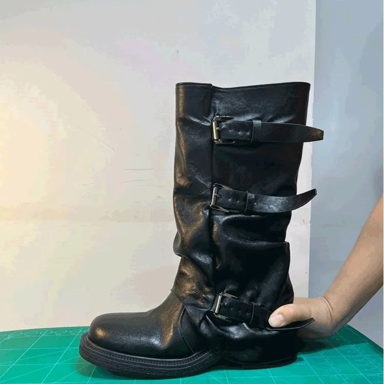 Factory Wholesale Female Vintage Slouch Boots Western Style Mid Calf Wide Leg Black PU Leather Women Knee High Boots
